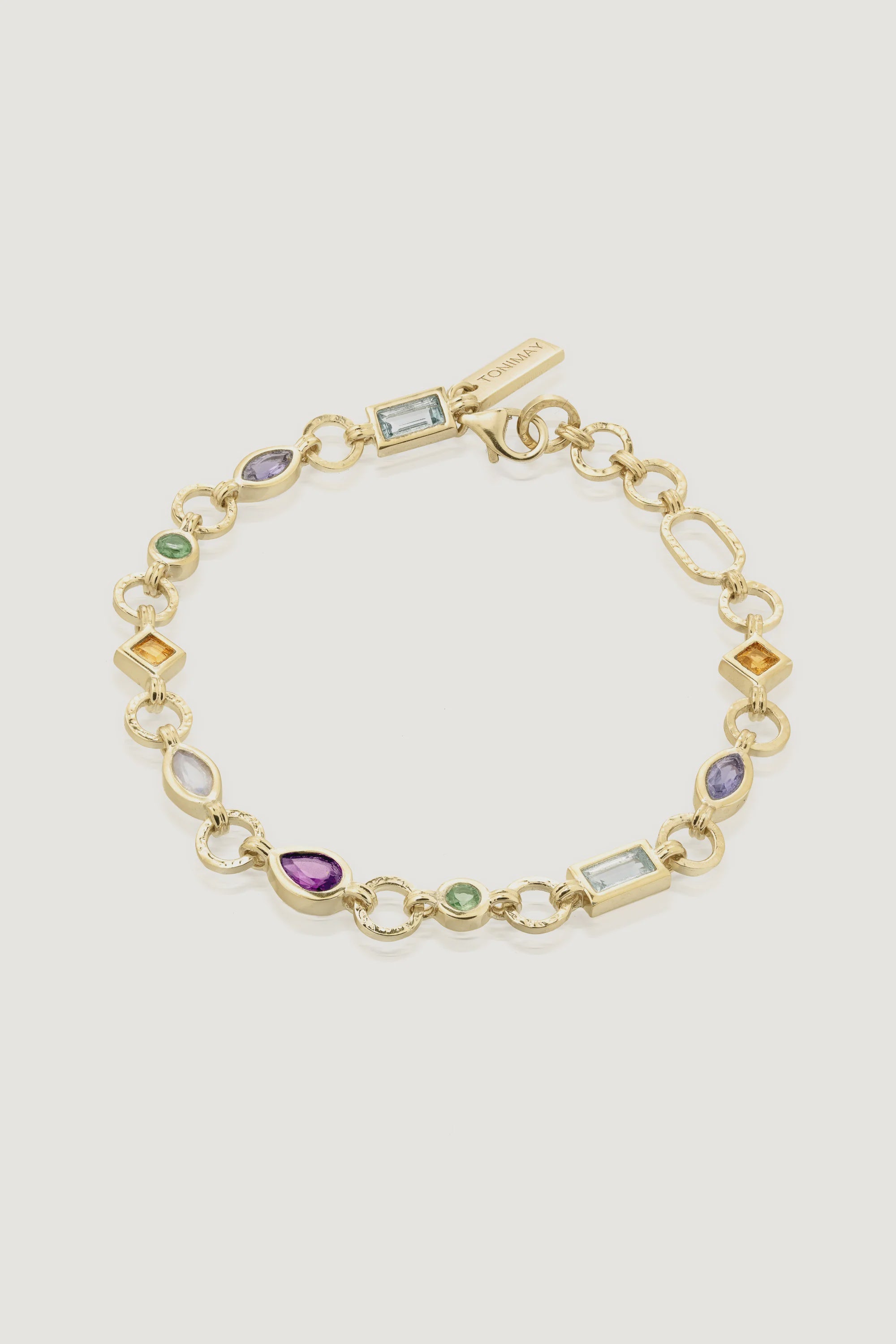The Calypso Bracelet is a celebration of colour, embracing a kaleidoscope of natural hand cut stones. The Calypso uses Apatite, Iolite, Citrine, Topaz, Moonstone and Rhodolite stones, each with a unique size and shape.