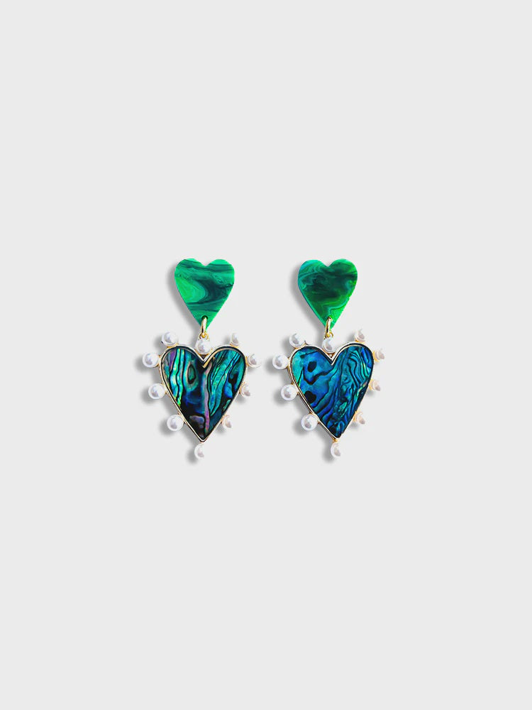 Size; 3cm x 5.5cm Materials; hand poured resin, 18k gold plated brass paua shell heart pendant with faux pearls Finding; hypoallergenic stainless steel earring post This is a lightweight earring. Each pair are handmade so will be unique just for you. A little note | This image should be used a guide only. Due to the nature of the materials and processes required to create our beautiful pieces, each pieces colour and pattern will be unique. We always endeavour to create pieces as close as possible to what is represented in the photo and we only ship what we love and would wear ourselves. Colours may vary depending on your computer and device screen - we do our best to accurately present colours and tones. The colours represented are in such a way if you were to hold your piece in the dazzling sunshine.