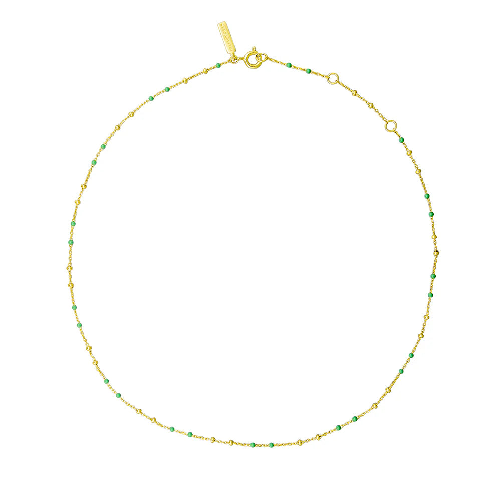 The Joleen Necklace features pairs of gold balls consecutively dispersed next to pairs of green natural stones. This necklace is perfect for stacking with its shorter chain length, or to be worn alone for everyday elegance.