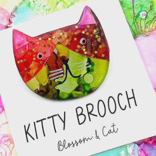 A colourful handmade collage Kitty Brooch! Painted with ink on yupo paper, embellished by hand and finished with a glossy resin on both sides. Each handcrafted Kitty is one of a kind. A cute mini artwork for you to wear everyday. · Green glitter back · Approx 40mm · Stainless steel brooch pin · Handmade in Melbourne * *