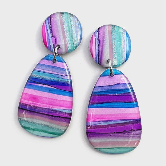 Organic multi-coloured stripes, painted by hand with ink on yupo paper, finished with glossy domed resin on both sides. Lightweight to wear. Each handcrafted pair is one of a kind. · Multi with black glitter back · Approx 54mm high inc top, top 18mm, 20mm wide · Surgical steel posts embedded in resin · Handmade in Melbourne