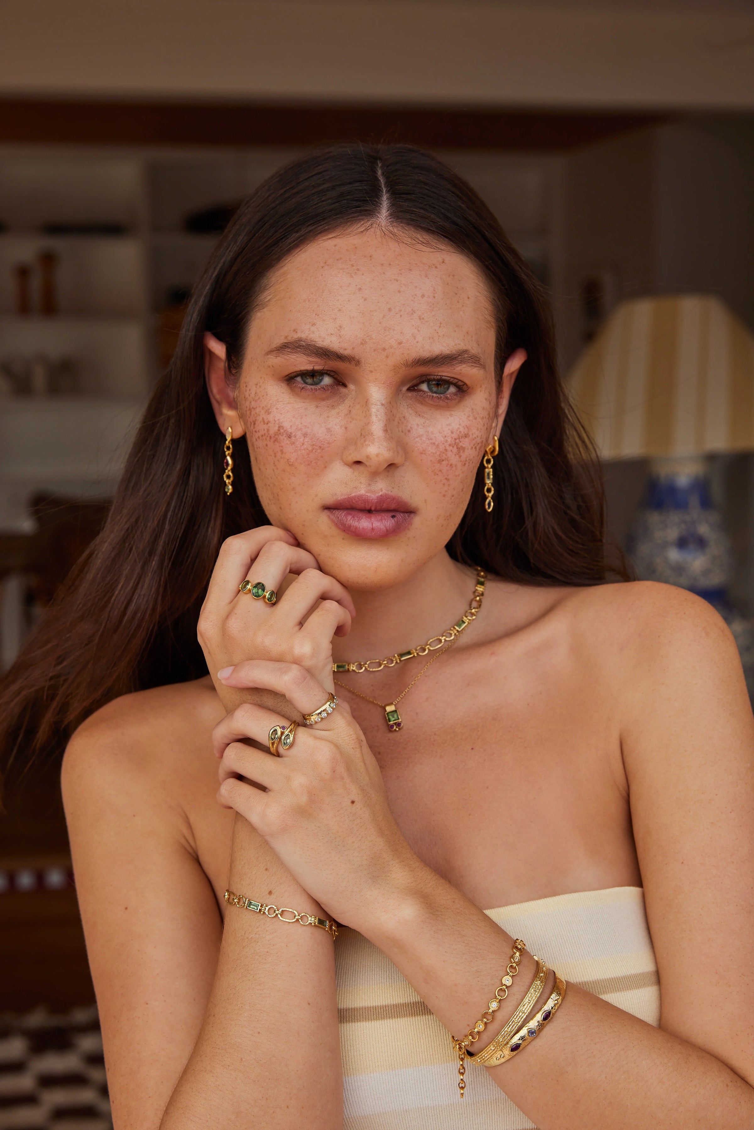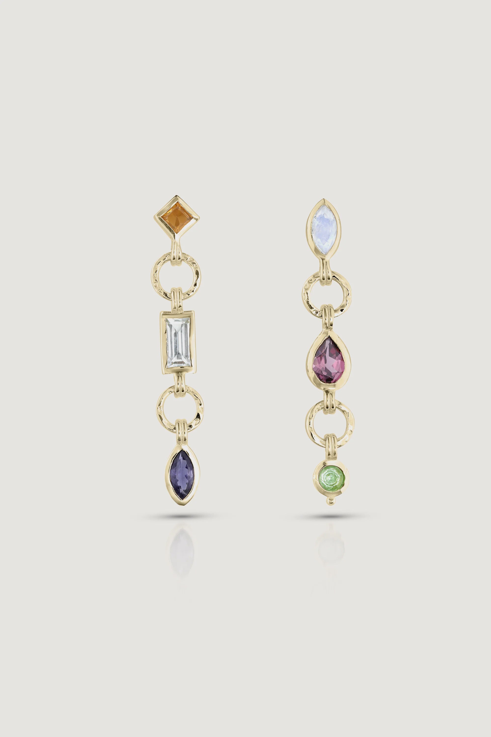 A bold celebration of colour, these asymmetric stunners feature a unique trio of hand-cut stones in each earring, from Moonstone, Rhodolite and Apatite, to Citrine, Blue Topaz and Iolite. Handmade with lightly hammered organic finishes and bezel settings, they’re the perfect statement pair to complete the Calypso collection.