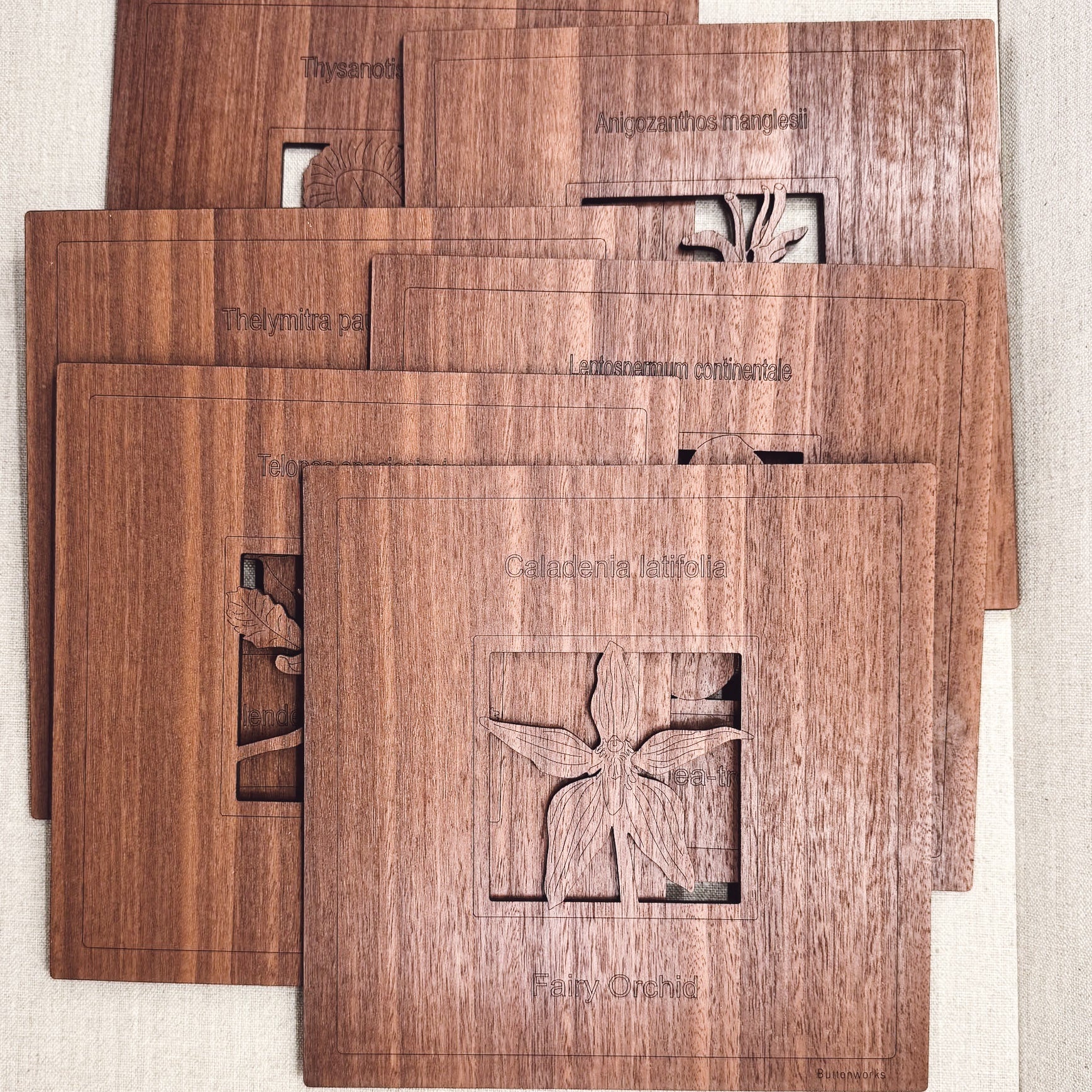 Each set is made from sustainably sourced Australian timbers, and are available in Myrtle, Blackwood, Jarrah or Tasmanian Oak. Every tree is different, therefore the colour and grain of timber varies, making each of our products unique. The real work has been done by the tree, we have added the craftwork.