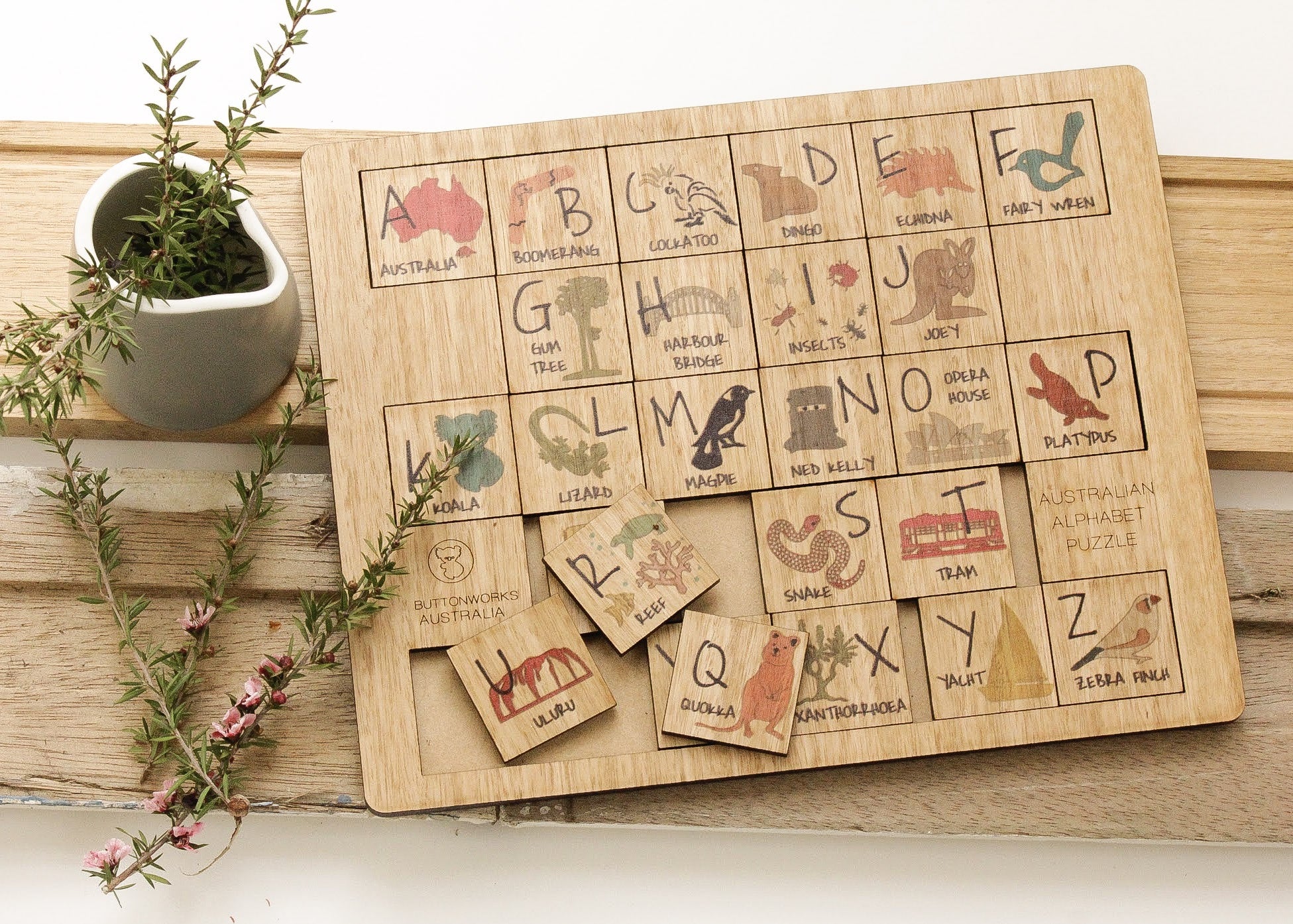Australian Alphabet puzzle, featuring well known Australian animals, plants and icons. Lightweight, flat packed and wrapped for easy travelling (size 25cm x 20cm). Every tree is different, therefore the colour and grain of timber varies, making each of our products unique. The real work has been done by the tree, we have added the craftwork.