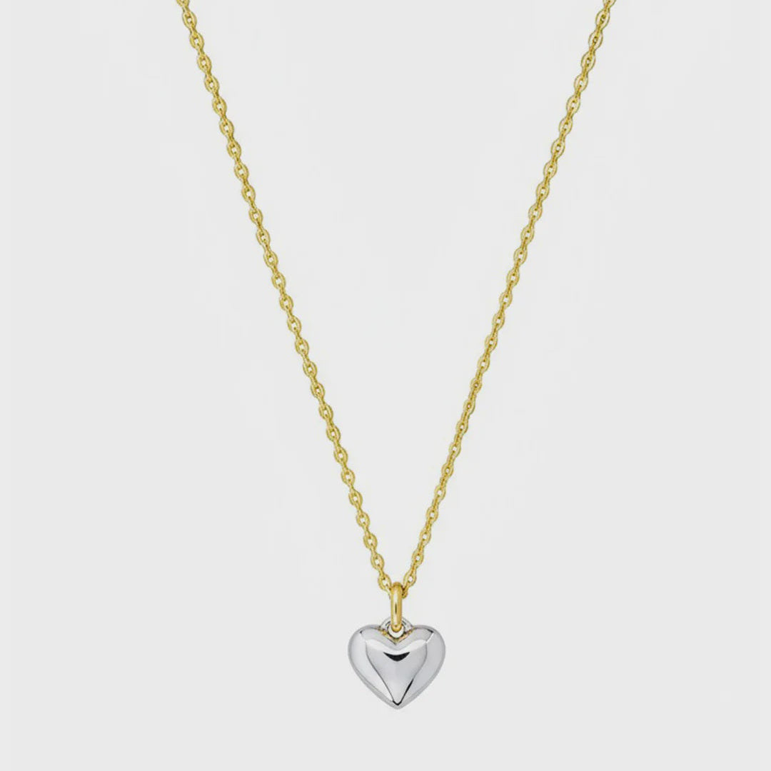 The Celine Necklace features a delicate fine gold chain with a silver heart hanging pendant. This piece's mix metal will add a pop to your everyday outfits.
