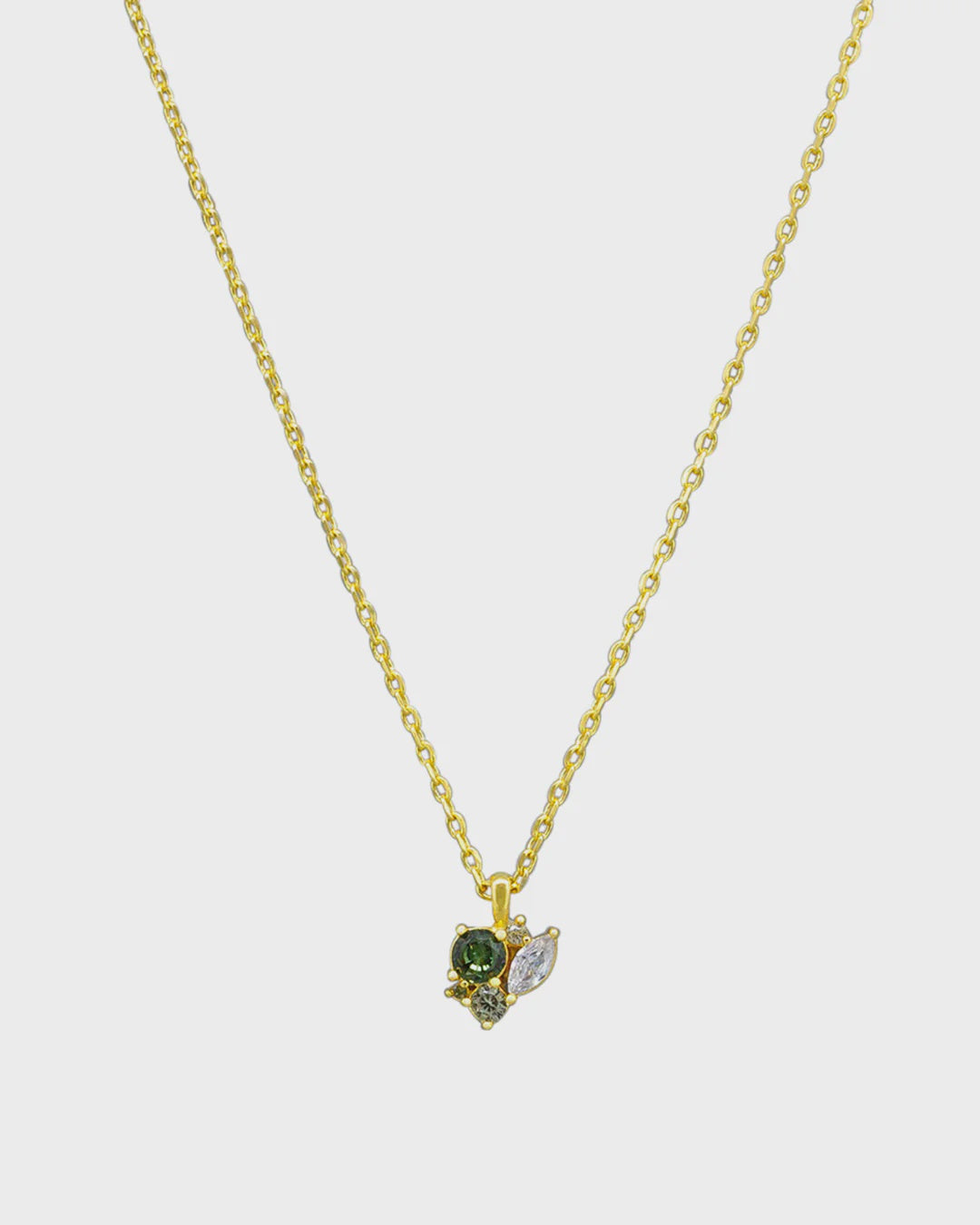 DESCRIPTION: The Dee Necklace features a fine chain with a clustered crystal design pendant with green and grey hues. This elegant piece seamlessly transitions from daily wear to special occasions, offering a refined touch of sparkle that complements any outfit with understated luxury.