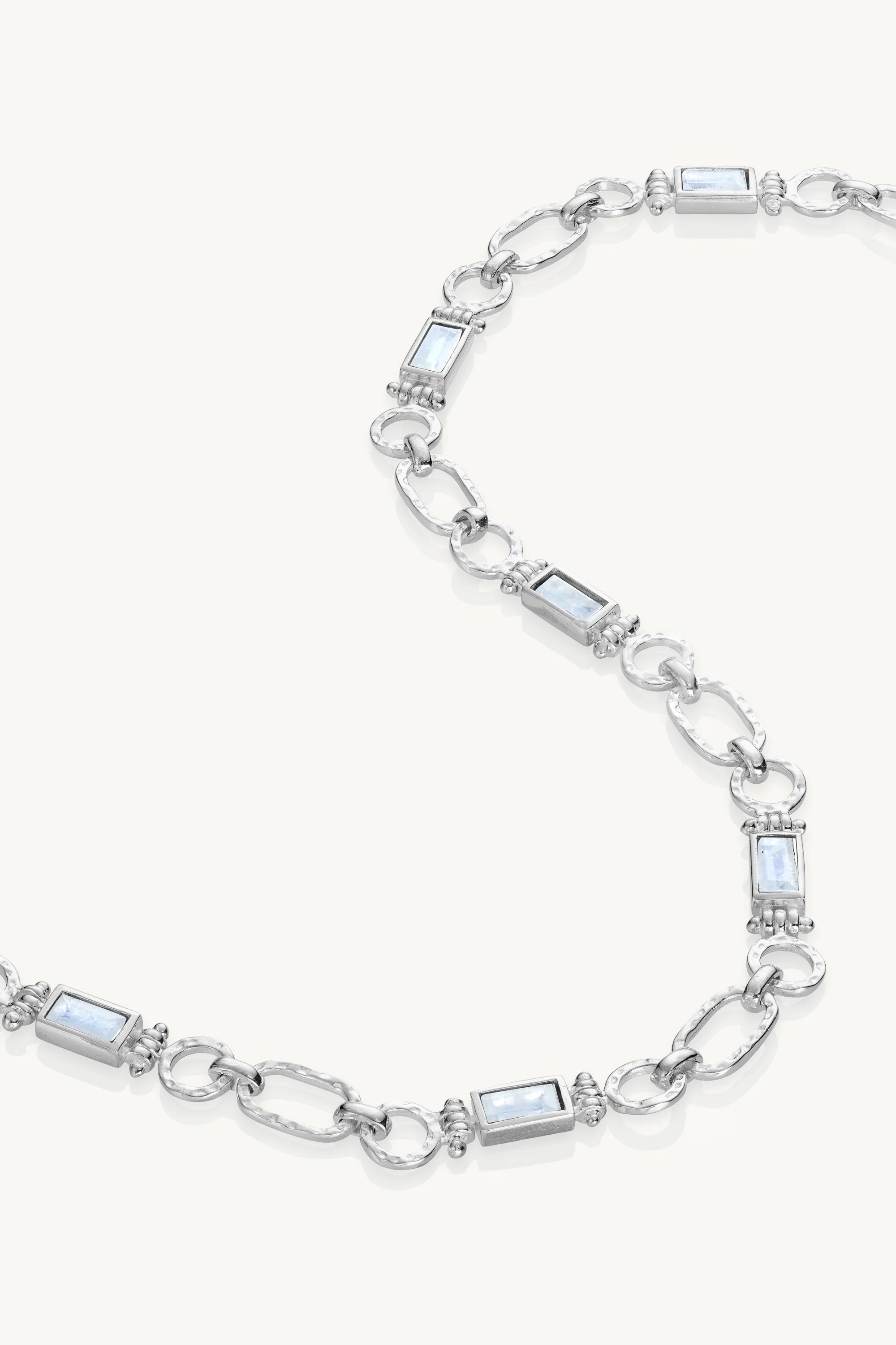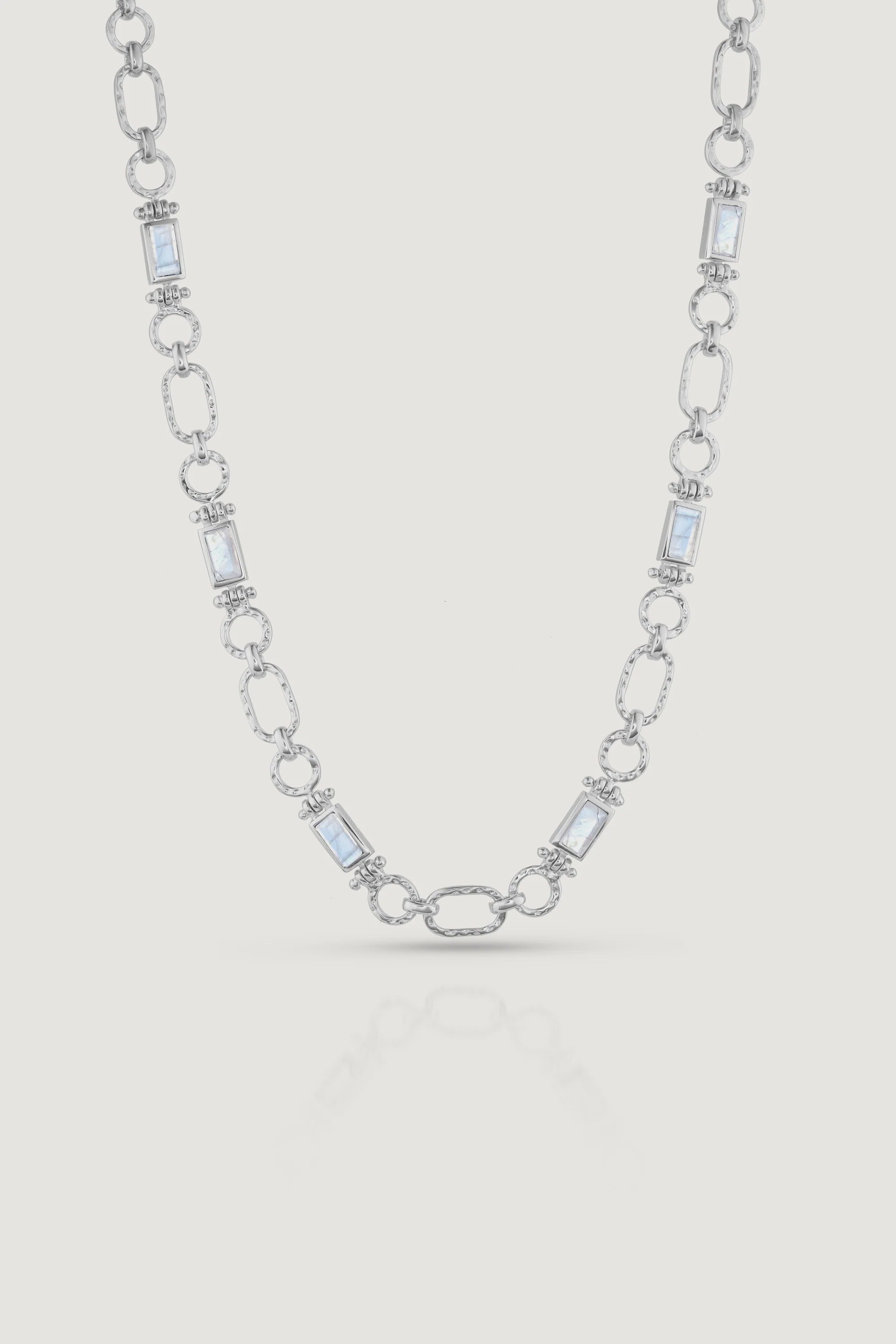 The Petra Necklace is a true testament to craftsmanship. Handcrafted with precision, its unique chain link design and baguette-cut Moonstones come together in a standout piece.