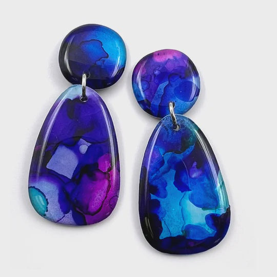 Painted by hand with ink on yupo paper, finished with glossy domed resin on both sides. Super lightweight and fun to wear. Each handcrafted pair is one of a kind. · Multi with black glitter back · Approx 54mm high inc top, top 18mm, 20mm wide · Surgical steel posts embedded in resin · Handmade in Melbourne * * * Each pair of earrings are beautifully unique. You may find tiny bubbles or variances to the surface or thickness of the resin, adding to the individuality and handmade aesthetic. Keep dry and store out of direct sunlight. Please check the size carefully before ordering. Variation in colour may occur between devices. Your order will be carefully packed and includes tracking.