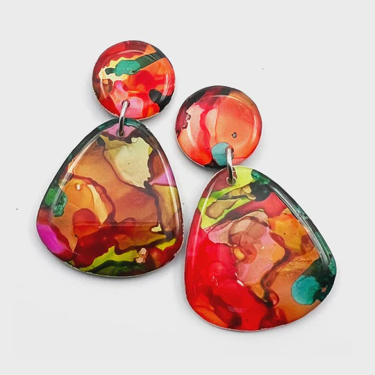 Painted with ink, embellished by hand and finished with glossy domed resin on both sides. Each handcrafted pair is one of a kind. · Multi · Black glitter backs · Approx 52mm high inc top, 30mm wide, 15mm top · Surgical steel posts embedded in resin · Handmade in Melbourne * * * Each pair of earrings are beautifully unique. You may find tiny bubbles or variances to the surface or thickness of the resin, adding to the individuality and handmade aesthetic. Keep dry and store out of direct sunlight. Please check the size carefully before ordering. Variation in colour may occur between devices. Your order will be carefully packed and includes tracking.