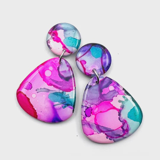 Painted with ink, embellished by hand and finished with glossy domed resin on both sides. Each handcrafted pair is one of a kind. · Multi · Black glitter backs · Approx 52mm high inc top, 30mm wide, 15mm top · Surgical steel posts embedded in resin · Handmade in Melbourne * * * Each pair of earrings are beautifully unique. You may find tiny bubbles or variances to the surface or thickness of the resin, adding to the individuality and handmade aesthetic. Keep dry and store out of direct sunlight. Please check the size carefully before ordering. Variation in colour may occur between devices. Your order will be carefully packed and includes tracking.