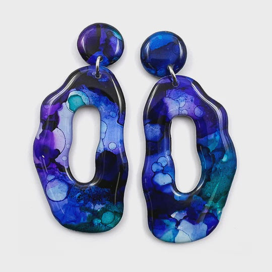 Painted by hand with ink and acrylic on yupo paper, finished with glossy domed resin on both sides. Super lightweight and fun to wear. Each handcrafted pair is one of a kind. · Multi with black glitter backs · Approx 65mm high inc top, 30mm wide · Surgical steel posts embedded in resin · Handmade in Melbourne * * * Each pair of earrings are beautifully unique. You may find tiny bubbles or variances to the surface or thickness of the resin, adding to the individuality and handmade aesthetic. Keep dry and store out of direct sunlight. Please check the size carefully before ordering. Variation in colour may occur between devices. Your order will be carefully packed and includes tracking.