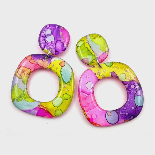 Painted by hand with ink and acrylic on yupo paper, finished with glossy domed resin on both sides. Super lightweight and fun to wear. Each handcrafted pair is one of a kind. · Multi with pink glitter back · Approx 55mm high inc top, 35mm wide · Surgical steel posts embedded in resin · Handmade in Melbourne * * * Each pair of earrings are beautifully unique. You may find tiny bubbles or variances to the surface or thickness of the resin, adding to the individuality and handmade aesthetic. Keep dry and store out of direct sunlight. Please check the size carefully before ordering. Variation in colour may occur between devices. Your order will be carefully packed and includes tracking.