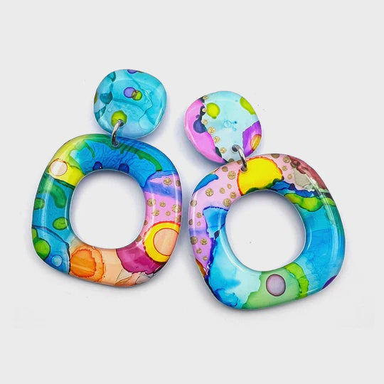 Painted by hand with ink and acrylic on yupo paper, finished with glossy domed resin on both sides. Super lightweight and fun to wear. Each handcrafted pair is one of a kind. · Multi with blue glitter back · Approx 55mm high inc top, 35mm wide · Surgical steel posts embedded in resin · Handmade in Melbourne * * * Each pair of earrings are beautifully unique. You may find tiny bubbles or variances to the surface or thickness of the resin, adding to the individuality and handmade aesthetic. Keep dry and store out of direct sunlight. Please check the size carefully before ordering. Variation in colour may occur between devices. Your order will be carefully packed and includes tracking.