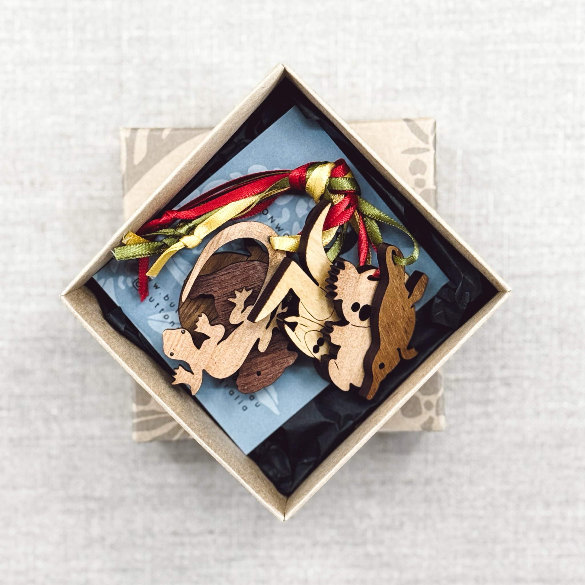 Box of 6 little hanging Aussie animal decorations cut from various sustainably harvested timber veneers. Decorations approx 4cm x 4.5cm and hang on ribbon. Decorations arrive in a recycled cardboard gift box. Every tree is different, therefore the colour and grain of timber varies, making each of our products unique. The real work has been done by the tree, we have added the craftwork.